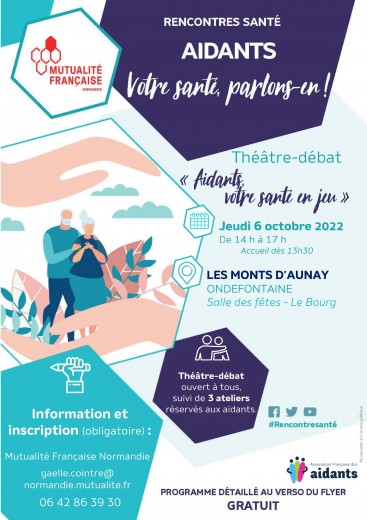 - le Jeudi 6 octobre 2022 de 14h à 17h à la salle des fêtes d'Ondefontaine : théâtre-débat autour de la santé de l'aidant, suivi d'échanges avec des professionnels de l'accompagnement.