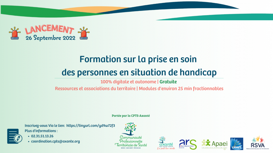 Crée le 29 septembre 2022La CPTS-Axanté a lancé le 26 septembre sa formation 100% digitale, autonome et gratuite sur la « Prise en soin des personnes en situation de handicap » !