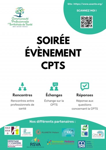 Lors de cette soirée vous sera présenté ce qu'est la CPTS Axanté ainsi qu'un point sur ses différents projets. Les différents partenaires du territoire tels que Normandie Pédiatrie, Planeth Patient, MSA, RSVA, Dépistage des Cancers, Normand'eSanté, OncoNormandie, CSNP, CLIC et HAD-SSIAD du CHAB seront présents. Cet évènement sera un lieu de rencontres et d'échanges entre professionnels de santé.