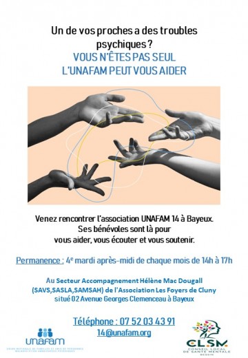 Crée le 17 juin 2024Les bénévoles de l'UNAFAM proposent des temps de rencontre le 4ème mardi après-midi de chaque mois de 14 h à 17 h à l'attention des proches de personnes atteintes de troubles psychiques.